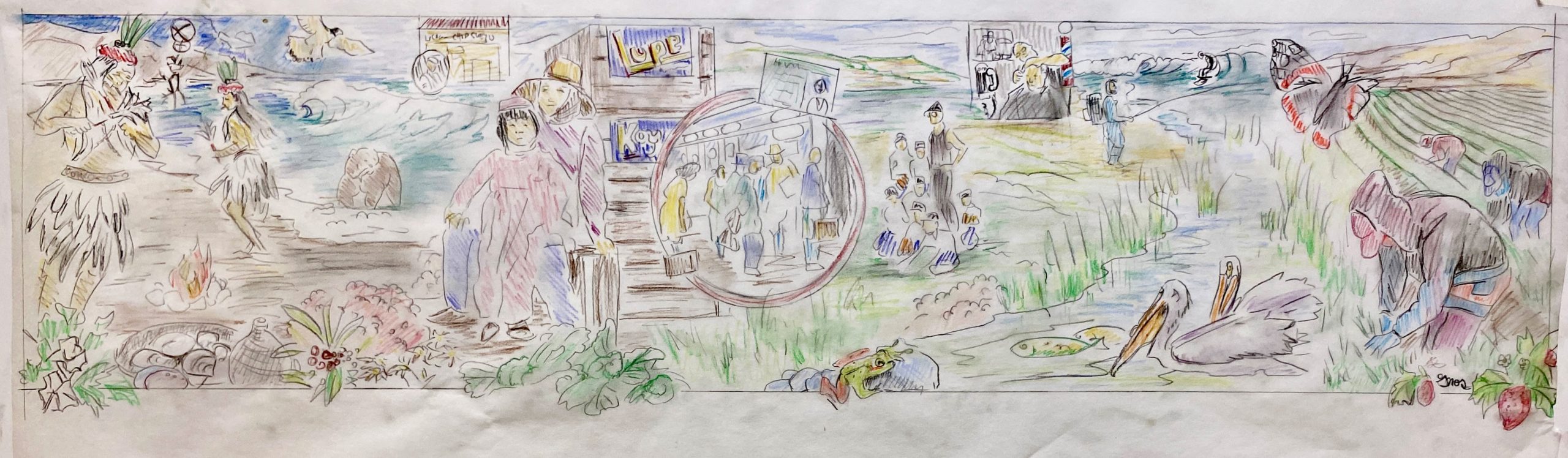 My mural reflects a rich narrative of the history of this fascinating town. I did extensive research for this project including: working with a Chumash expert at the Chumash museum; reviewing photos, books and letters; listening to podcasts; interviewing dozens of individuals and subject experts; and exploring accounts of local history.