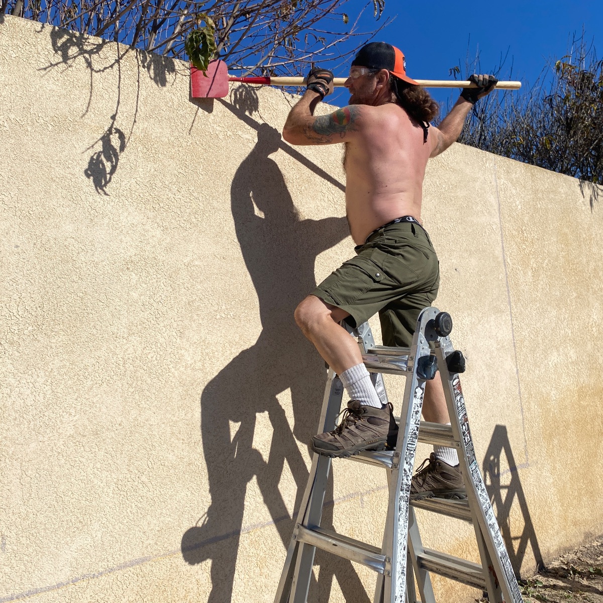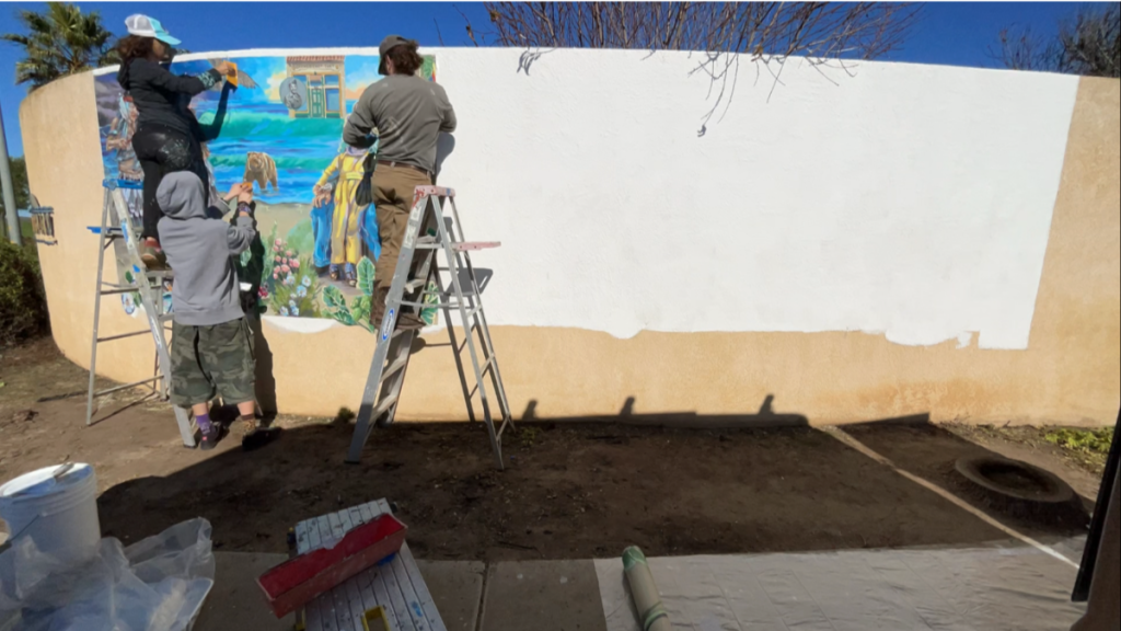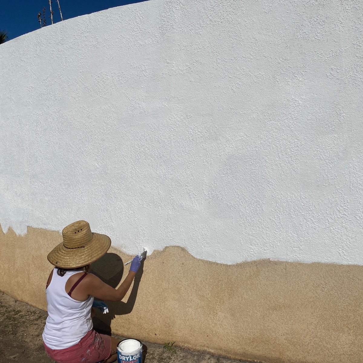 Wall prep and priming day for Coastal Stories mural painted on polytab. We knocked the peaks off the stucco after the city of Guadalupe pressure washed and bleached the lichen off the wall. Primed it, filled gaps with patching compound, primed it again. This wall is ready for a mural!