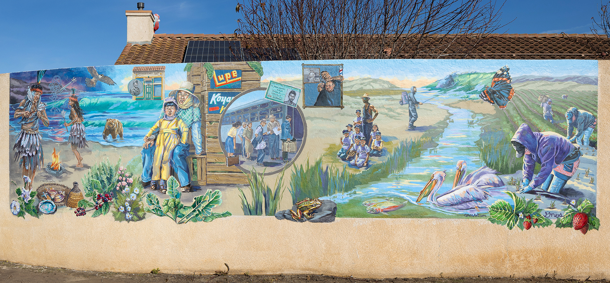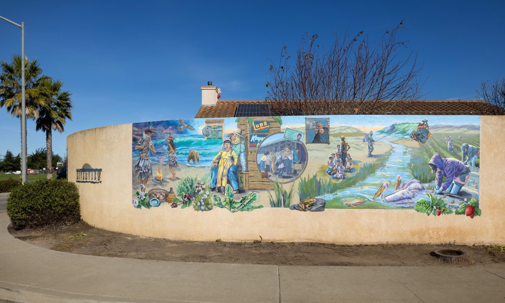 Sharp-eyed viewers may find (amongst many other things): Tule Grass, Broccoli, the North Star, a Peregrine Falcon, Grizzly Bear, Coastal Sage, and a Red Admiral Butterfly.  You will also see a Chumash Barracuda Dance, the old Bud Wong and Chicago Chop Suey restaurant, Mixtec workers, Joe Harris, Harry Masatani, and Gilbert Robles.  There is even more in the mural so be sure to stop by and take it all in…see what else you can find!