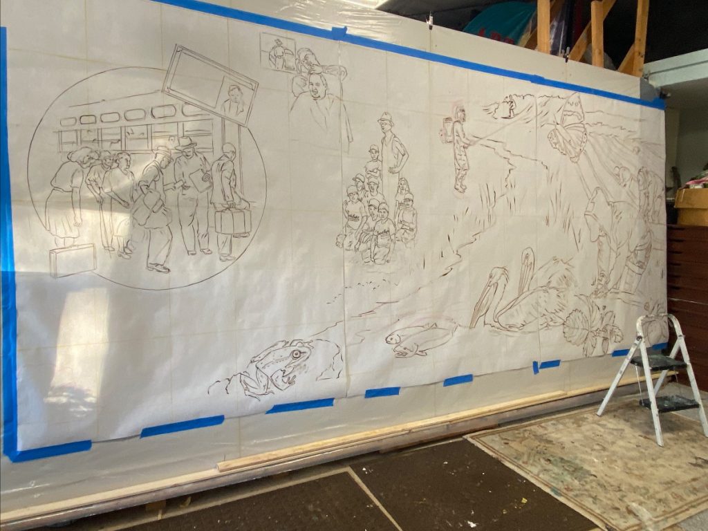 I painted the 25 foot long mural in sections on polytab fabric in my studio, using a 20′ custom easel, built by my husband, Che Miller. He also helped me prepare the wall surface and install the final mural sections.